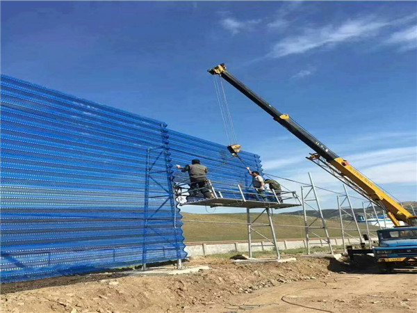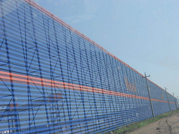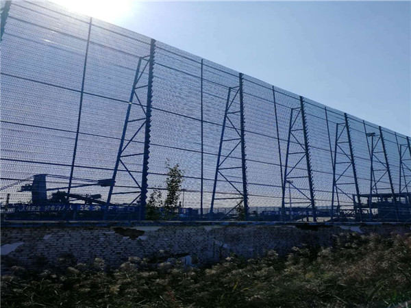 煤場(chǎng)防風(fēng)抑塵網(wǎng) 露天煤場(chǎng)防風(fēng)抑塵網(wǎng)又叫防風(fēng)抑塵墻,擋風(fēng)墻,抑塵墻,擋風(fēng)抑塵墻。 材質(zhì):低碳鋼板、
